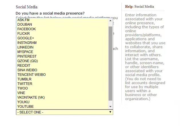 北京时间5月31日起,美国使馆将要求签证申请人提交自己的社交平台账户名称。范围涉及QQ空间、豆瓣、新浪或腾讯微博、优酷及其他主要国外流行社交平台。