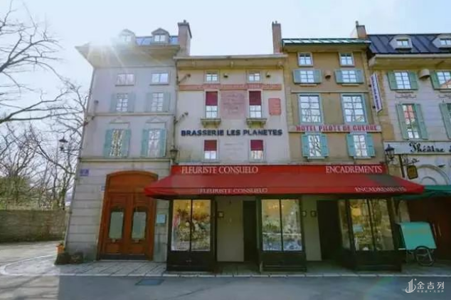 下车之后,首先映入眼帘的,是让人彷彿置身于法国街道的错觉感,建筑物真的好欧洲,超美。白色的铸铁门上,悬挂著的星星、星球及法国国旗,都是专属小王子的特有素材。