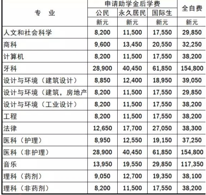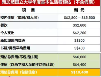 主要分学费,生活费及少量杂费。学费又分全自费和助学金后学费。全自费就是全额缴付大学学费,毕业后没有任何服务协议。助学金后学费是指申请了新加坡教育部助学金(MOE TG),只缴付扣除助学金后剩余的学费,毕业后有三年服务协议,需要在新加坡注册的公司工作三年。新加坡国立大学为了减轻学生的经济负担,提供多种经济援助及补贴,学生可以根据自身条件进行申请。新加坡国立大学还设有各种奖学金,奖学金的申请及福利各不相同,