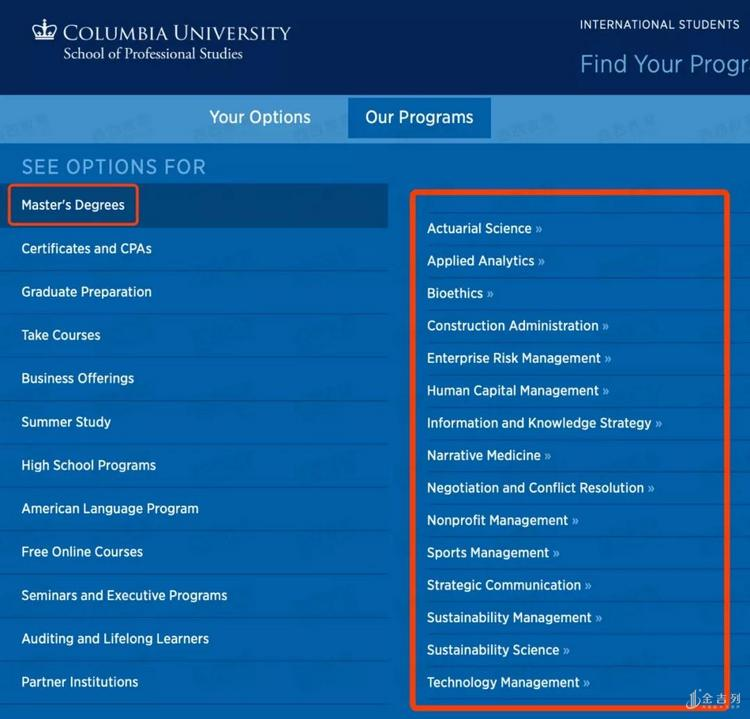 对于成绩和背景足够好的申请者,也许商学院、理工学院、文理学院确实是更好的归宿。但对于成绩「差一口气」的学生来说,各类CPS和SPS也是很不错的选择。录取条件稍微有所降低更重要的一点是, 有的专业可能只开设在CPS或者SPS下面 。例如,虽然大家都说哥伦比亚大学的金融好,但其实哥大商学院并没有开设金融专业,所谓的金融排名指的是MBA下面的Finance Track,应届生无法申请。所以应届生大家申请最多的是CPS学院下的(Enterprise Risk Management)则成为了众多想读金融硕士的学生的选择。而且,别看这个项目在SPS下,录取要求可是一点也不低,拿到offer的申请者基本都是 良好的院校背景+GPA3.7+托福至少100+GRE至少320 的条件。