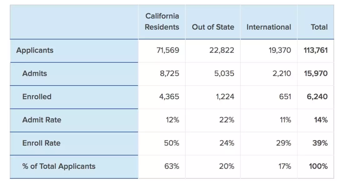 - 加州系统一11月30日截止,一个系统不申白不申,所以大部分人会前6所都申请,录取后可能一堆人都不入读,比如下图UCLA的统计: