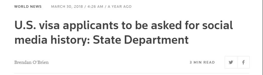 要求外国人在申请美国签证(移民/非移民)时提供过去5年使用的社媒账号/邮箱地址/电话号码/海外旅行记录/有没有被其它国家遣送出境过等信息。