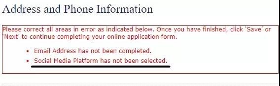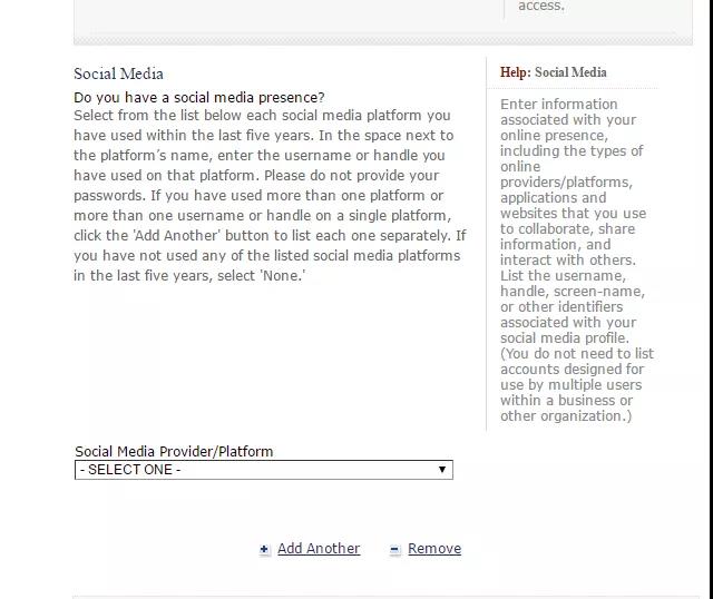 在填写DS160申请表的时候,申请者必须填写自己的社交媒体信息,如果没有填写,将不允许跳转到下一页。