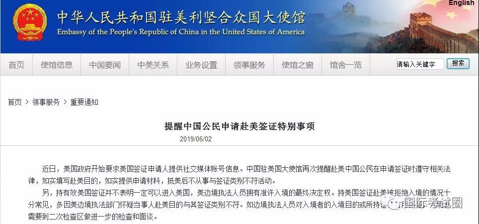 在填写申请表的过程中,新增加了申请人社交媒体的信息。虽然可以选择“无”,但不建议隐瞒。针对此要求,中国驻美大使馆也发出提醒: