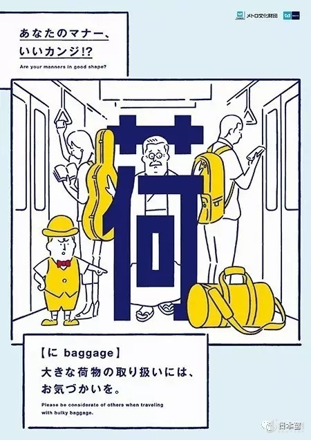 ▼ 回到文章开始时的的问题:背包应该如何处理呢?福冈地铁内的标志就给出了答案,图示还是相当容易理解的。