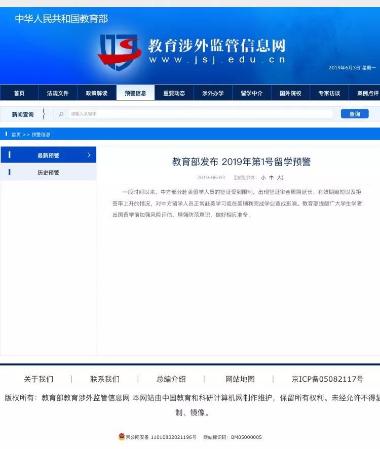 一段时间以来,中方部分赴美留学人员的签证受到限制,出现签证审查周期延长、有效期缩短以及拒签率上升的情况,对中方留学人员正常赴美学习或在美顺利完成学业造成影响。教育部提醒广大学生学者出国留学前加强风险评估, 增强防范意识,做好相应准备。