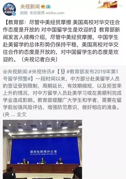 教育部新闻发言人续梅介绍中美经贸摩擦对两国教育交流合作领域的影响,称尽管中美经贸摩擦,中国学生赴美留学的总体形势仍保持平稳, 美国高校对华交往合作的态度是开放的,对中国留学生的态度是欢迎的。