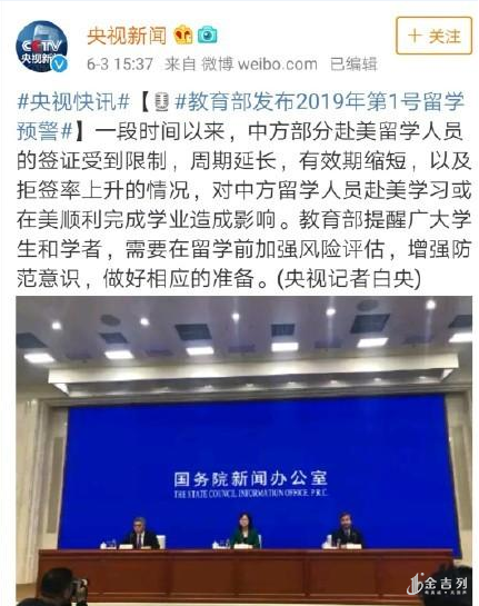 消息出来后,朋友圈和各大新闻媒体都陷入了恐慌,纷纷把一段文字铺出并宣传出去。再加上上周朋友圈里流行的“哥大硕士生被问及贸易战后拒签”事件,还没签证的学生已经在感叹“我的签证还能不能过了?”