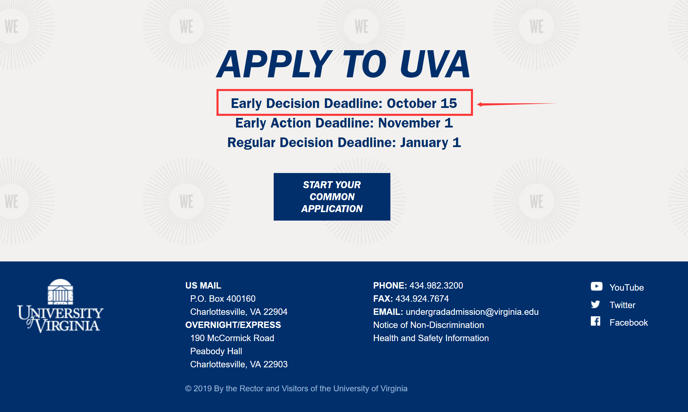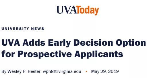 弗吉尼亚大学宣布向高中生提供了一个新的在ED阶段申请该校的机会。ED是为在秋季的时候就已经决定把弗吉尼亚大学当做第一志愿的学生设计的。这是一个绑定录取的计划,意味着在ED阶段被弗吉尼亚大学录取的学生需要接受这所大学的录取通知,并且取消他们对其他所有学校的申请。