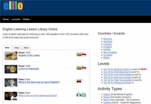 Elllo网是英语听力在线实验室,有来自世界各地说英语的人的听力素材,主要聚焦在练习听力技能。有各种不同的话题,比如体育、旅游、游戏等,更棒的是每个音频播放器下都会有相关的听力文本,让你可以边听边对照。