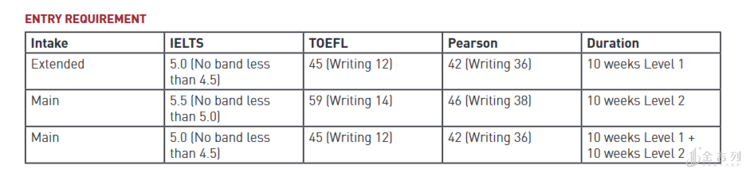 根据学生不同的语言情况,可以选择 10 周或 20 周的课程来衔接 Main intake ,或者学习 10 周的课程来衔接 Extene intake 。更多信息如申请要求、学费、开课日期等也可咨询金吉列留学澳新王老师!