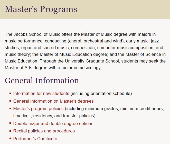 雅各布音乐学院提供音乐硕士学位,主修音乐表演,指挥(合唱,管弦乐和风),早期音乐,爵士乐研究,管风琴和神圣音乐,作曲,计算机音乐创作和音乐理论; 音乐教育硕士学位; 和音乐教育理学硕士。通过大学研究生院,学生可以获得音乐学专业的文学硕士学位。