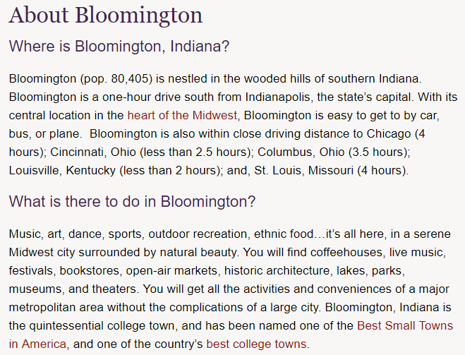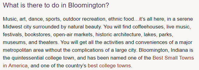音乐,艺术,舞蹈,体育,户外娱乐,民族美食……这一切都在这里,在一个宁静的中西部城市,被自然美景所包围。你会发现咖啡馆,现场音乐,节日,书店,露天市场,历史建筑,湖泊,公园,博物馆和剧院。您将获得一个主要大都市区的所有活动和便利,没有大城市的复杂性。印第安纳州布卢明顿是典型的大学城,并被评为 美国最佳小城镇 之一,也是该国 最好的大学城之一 。