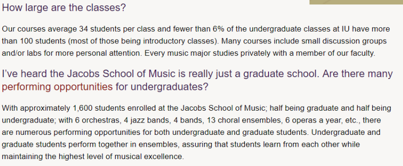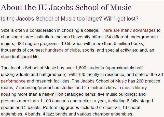 大小通常是选择大学时的考虑因素。选择大型机构 有很多好处 。印第安纳大学提供134个不同的本科专业; 328学位课程; 19个图书馆藏书超过600万册; 成千上万的课程; 数百个俱乐部 ,体育和特殊活动; 而且,丰富的社交生活。