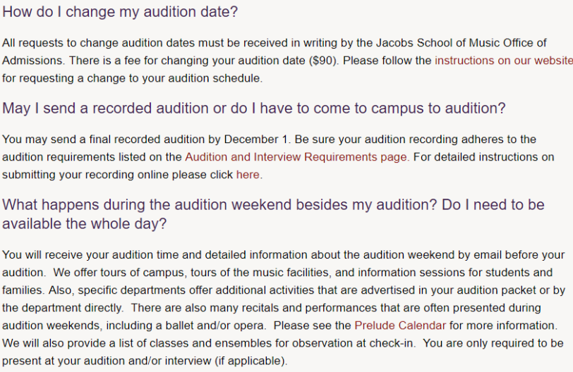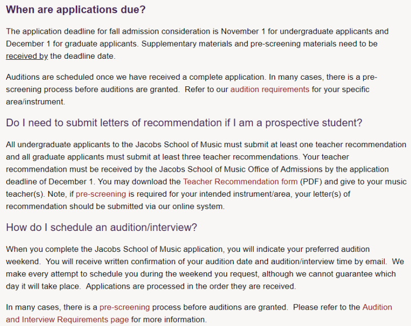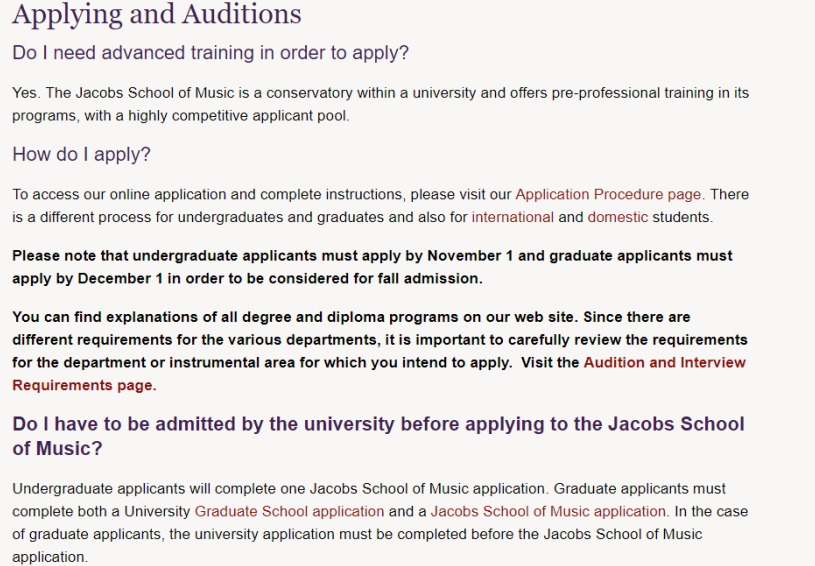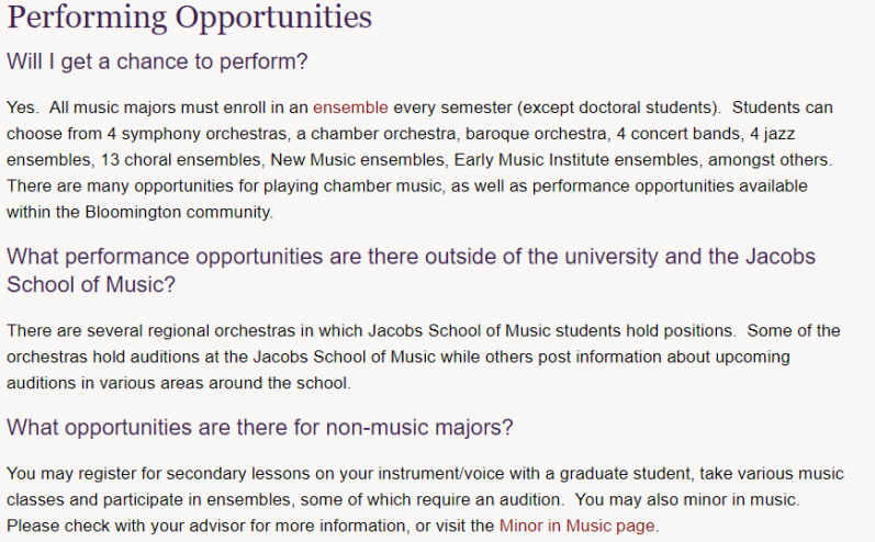 所有音乐专业的学生必须每学期参加一次 合奏 (博士生除外)。学生可以选择4个交响乐团,室内乐团,巴洛克乐团,4个音乐会乐队,4个爵士乐团,13个合唱团,新音乐合奏团,早期音乐学院合奏团等。有很多机会可以播放室内音乐,以及Bloomington社区内的演出机会。