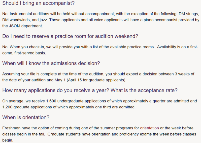 约有1,600名学生就读于雅各布音乐学院; 一半是研究生,一半是本科生; 有6个管弦乐队,4个爵士乐队,4个乐队,13个合唱团,每年6个歌剧等,本科生和研究生都有很多表演机会。本科生和研究生一起表演合奏,确保学生相互学习,同时保持最高水平的音乐表现。
