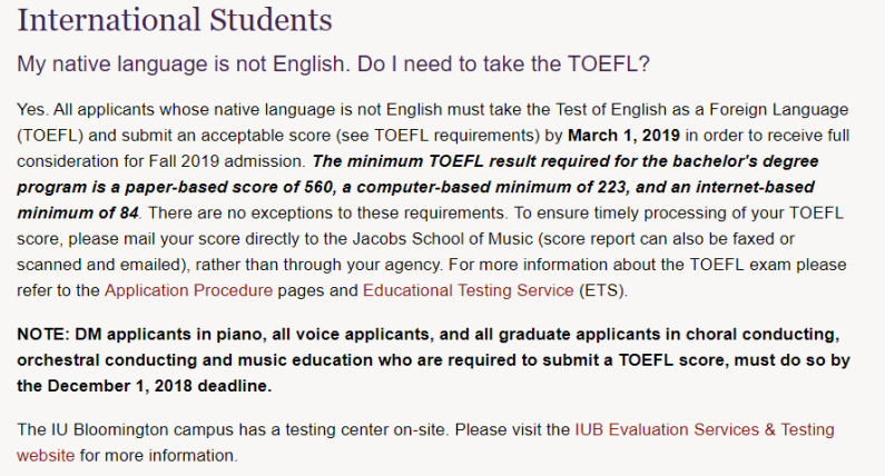 2019年3月1日之前提交可接受的分数(参见托福要求),以便获得2019秋季入学的全部考虑。学士学位课程所需的最低托福成绩是纸质成绩560,基于计算机的最低成绩223,以及基于互联网的最低成绩84****