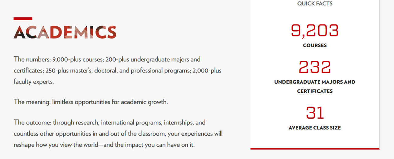 学校开设9203门课程,232个本科生专业 ,平均班级人数31人。