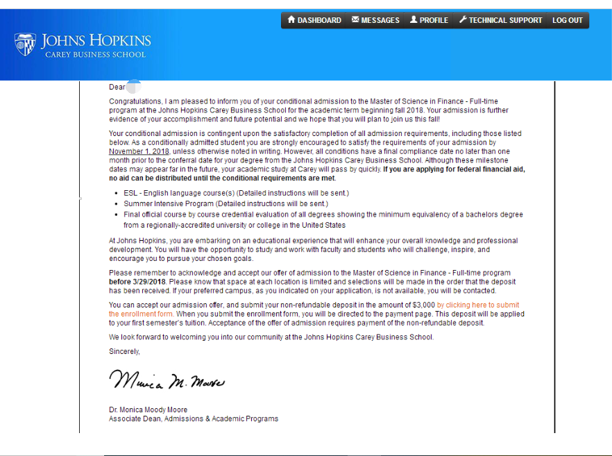 李同学性格非常好也非常积极的配合我们的所有工作。原计划在学生大二暑假的时候安排一次去美国的夏校,并且学生也录取的耶鲁的夏校,但是很可惜由于学生家庭经济突然出了问题,导致孩子没有办法去参加夏校。因此我们需要及时的修改学生的时间规划,将假期的时间安排了实习。不过学生也是非常争气的在学校积极与导师交流沟通,争取到了发表论文的机会。并且在每次面试前学生都会与我们进行面试的准备,把每个题目都提前写好并与我们约时间进行面试模拟。最终申请了约翰霍普金斯大学的录取。
