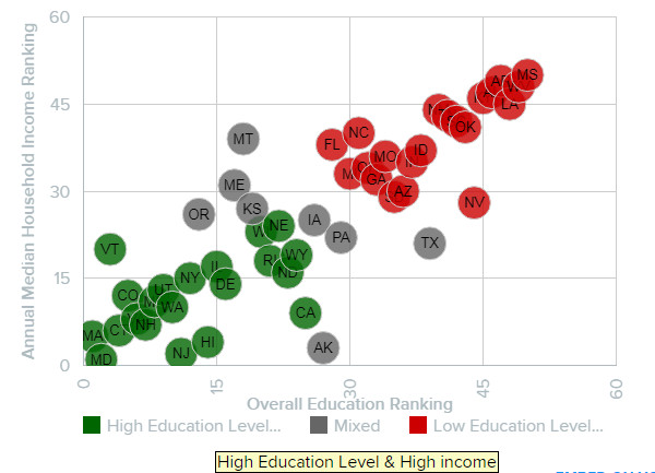 而教育水平最低5个州分别是密西西比州、西弗吉尼亚州、路易斯安纳州、阿肯色州、阿拉巴马州。