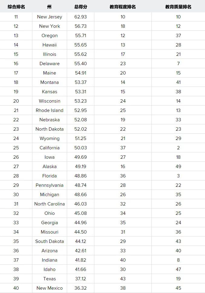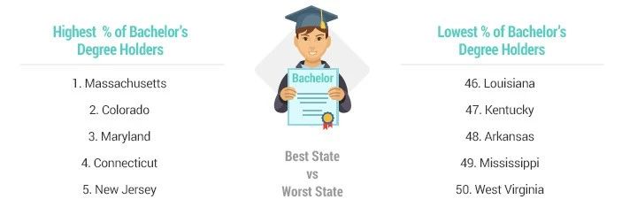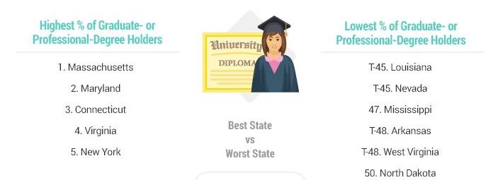 Wallethub从教育程度和教育质量两个方面, 对比了50个州的大学质量、毕业率、25岁以上获得学位比例等共20个指标,公布了全美教育水平最高的州排名 。