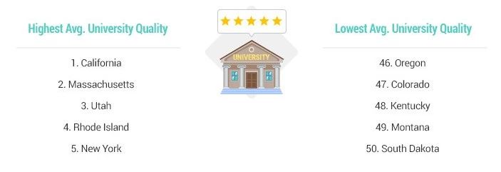 最后,Wallethub给了几张表。在大学质量最高和最低的州中, 加州、麻省、犹他州、罗得岛州、纽约州得分最高 ~