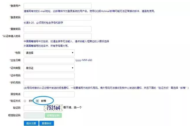 需注意,手机号码将接收认证过程中发送的短信通知,一定要填写内地手机号码。境外号码无法接收到认证中心发送的通知,并且下面的“验证方式”需选择“邮箱”