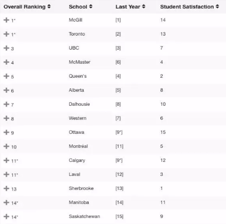 多伦多大学和麦吉尔大学的排名之争终于以双方并列第一暂告一段落,虽然麦吉尔大学劲头很足,但多伦多大学依然是声誉调查中排名第一的大学。 麦克马斯特大学较去年上升了两名,位列第四。去年这个位置的皇后大学降到了第五。渥太华大学排名没变,卡尔加里大学和拉瓦尔大学并列第 11 。其他排名略微上升的大学还有:戴尔豪斯大学、蒙特利尔大学、萨斯克彻温大学等。