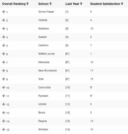 综合类大学排名较去年没有太大的变化,西蒙菲莎大学已经连续多年位列综合类的第一名,其人机交互 HCI 、计算机科学、和商科专业位居世界前列。 除此之外,维多利亚大学、滑铁卢大学、圭尔夫大学、卡尔顿大学、劳里埃大学的排名非常稳定,较去年没有变化,都是综合实力非常强的加拿大大学。 在教育、工程、商科、地质和医学方面有着雄厚背景的纽芬兰纪念大学( Memorial University )从去年的第八上升到了第七。