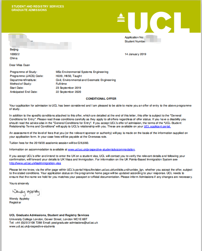 申请阶段:学生积极配合及时提供各个材料,文书老师在文书中强调了学生成绩上的优异和在年级的排名,也根据学生的需求写了很多专业方面的知识来告知学校学生对专业的认知。于UCL开放申请的第二天就递处申请,最终在12月拿到了世界排名第8位的UCLoffer。