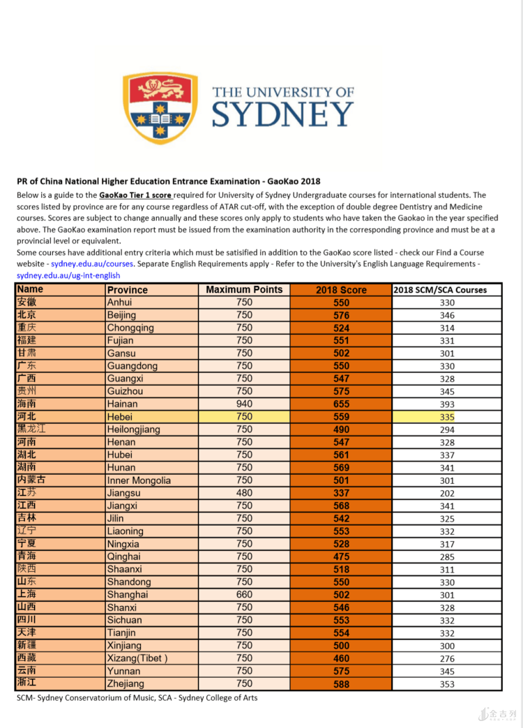 学生想要通过高考成绩直录大一,那么需要达到悉尼大学的录取分数线。悉尼大学针对不同省份会有不同的高考分数要求,见下表: