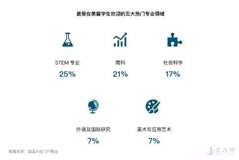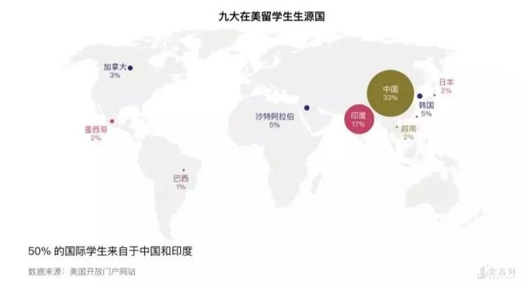 而其中,中国已经连续8年成为美国留学生的最大生源国。2017年,在美国的中国留学生人数共计350755,占总体美国留学生人群的32.5%,前十名其余按顺序依次为印度17.3%、韩国5.4%、沙特阿拉伯4.9%、加拿大2.5%、越南2.1%、日本1.7%、墨西哥1.6%、巴西