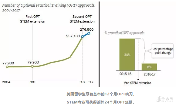 根据Pew Research Center的报告:在2017年,约有17.2万名在校生获得了OPT实习。从2008年到2016年,申请OPT项目的STEM领域学生人数增长了400%,来自中国、印度、韩国的学生占OPT总数的57%。
