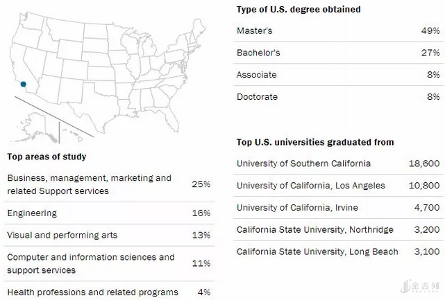 洛杉矶的国际生有97,700人,在全美仅次于纽约,STEM毕业生占了38%,大约78%的人选择在本地实习,不过即使去外地实习,也基本集中在加州。洛杉矶向103,600人提供了OPT实习,而且中国学生超过印度学生。