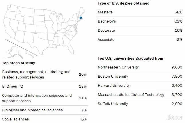 波士顿的国际生人数全美排名第三,有69,700名留学生,STEM毕业生占47%,大部分人选择在本地或纽约实习。波士顿向73,000人提供了OPT实习。中国学生和印度学生数量占据了大头,其余是韩国和加拿大学生。