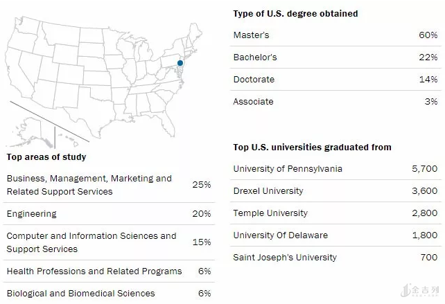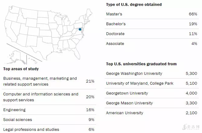 大华府都市圈的国际生数量不算少,有50,200人,大约68%的学生留在当地工作,其余学生大都选择去纽约,向60,800人提供OPT实习,49%是STEM专业。