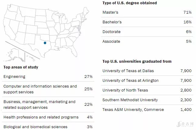 达拉斯都市圈一直稳居第四大都会的名号,并且有赶超芝加哥的趋势。这里留学生有45,100人,而提供OPT实习就有48,500个,可见其经济表现很好,而且STEM专业占比64%,国内的学生真可以考虑考虑这地儿。目前来说印度学生几乎占领了,仅印度学生就有23,500人,中国学生只有6,500。