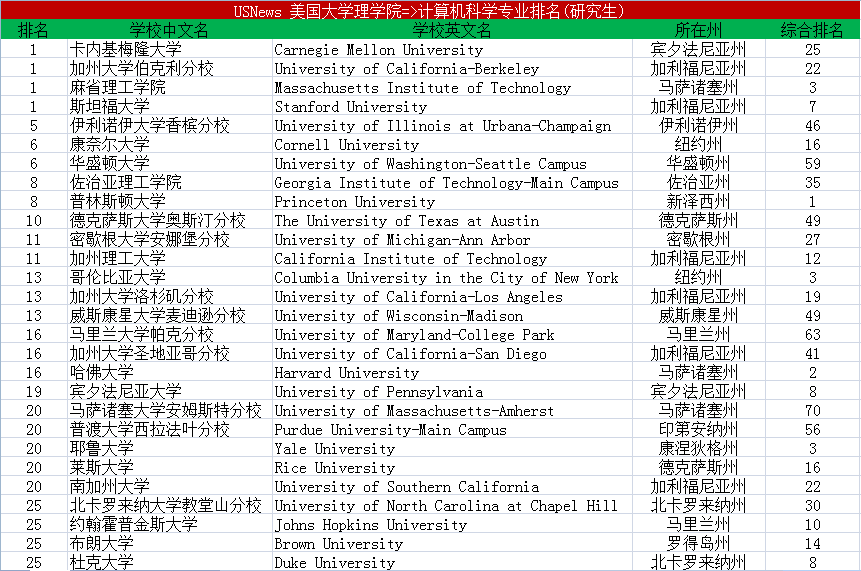 关于美国计算机科学专业(CS)排名如下面,排名来源于USNEWS官方网站。