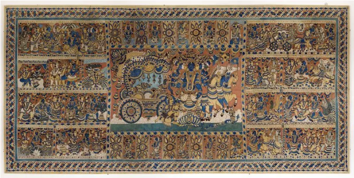 这一纺织作品来自Anra Praesh,采用Kalamkari风格,场景取材于《博伽梵歌》和印度神祗克里希纳。