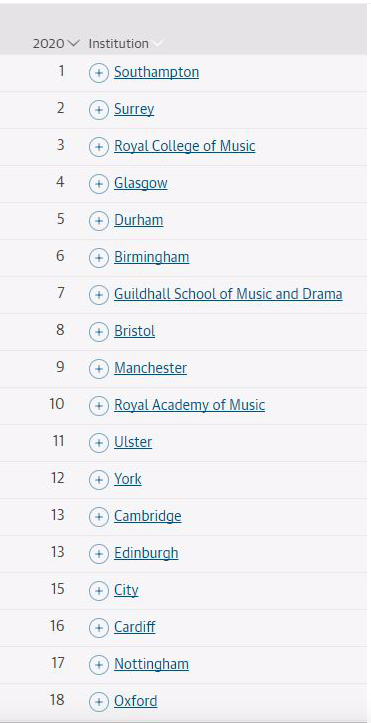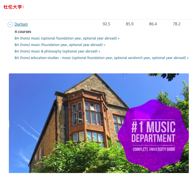 以下是英国卫报2020年英国大学专业排名: 音乐专业 Music