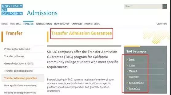 例如,加州大学的官网上能很容易的就找到有关社区转学的保录取协议TAG,其中红框内的6个校区都与加州的社区大学有此协议项目。