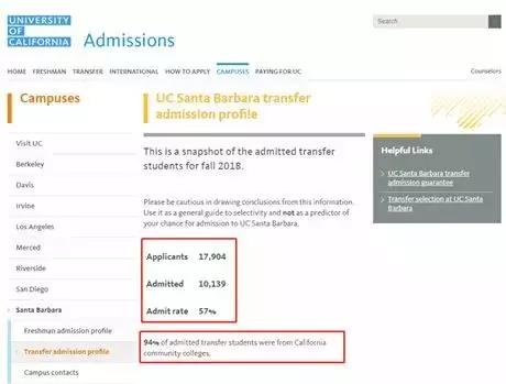 COLLEGE LIFE US NEWS排名30的加州大学圣芭芭拉分校(UCSB)2018年共有17904位转学生申请,录取了10139位学生,转学录取率高达57%,而这10139位申请者当中有94%都是来自加州的社区大学。