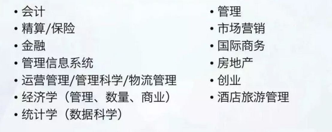 商科类有传统的四大方向:会计、金融、管理和市场营销,除此之外最近也有一些新兴的专业,比如说技术创新、企业家精神、供应链管理、信息系统管理等等。
