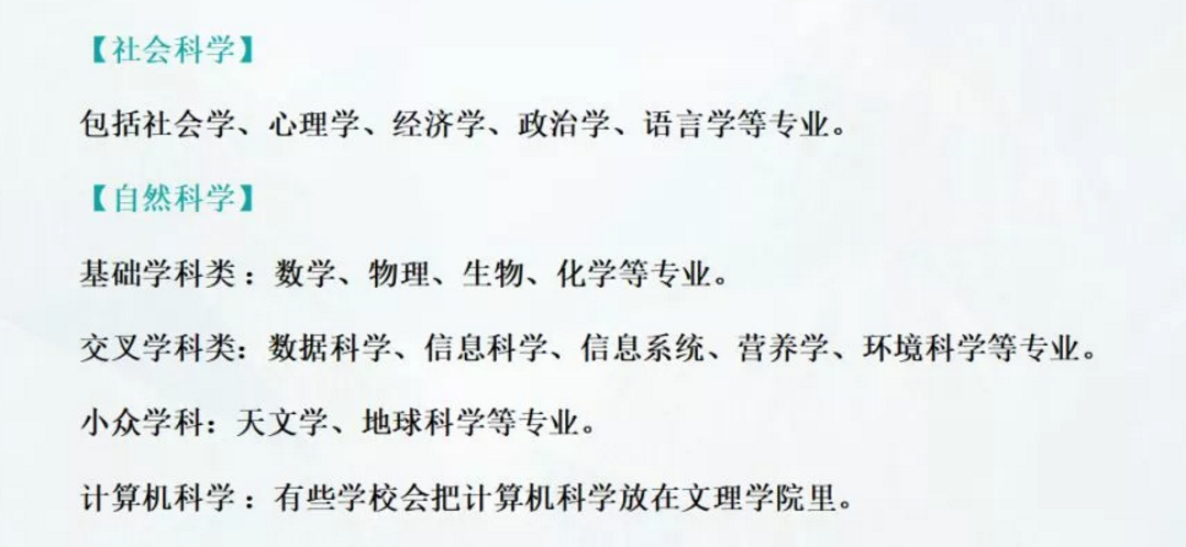 Science(理科)可以分为Social Sciences(社会科学)和Natural Sciences(自然科学)。