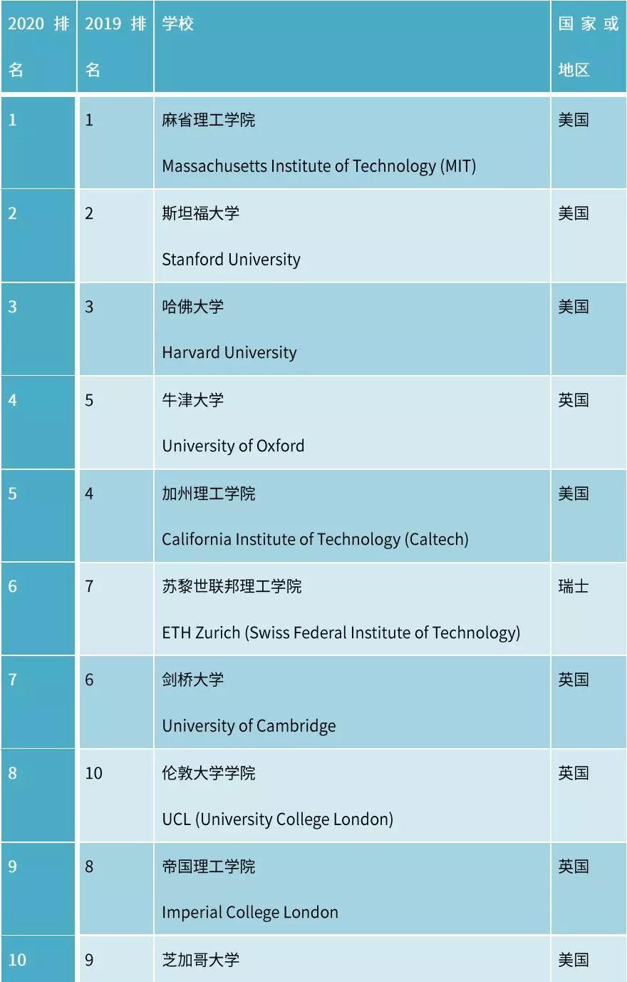 好在MIT连续八年保持在霸主地位,斯坦福大学和哈佛大学也紧随其后保住了前三名,加州理工和芝加哥大学纷纷下滑一名,分别位列第5和第10。