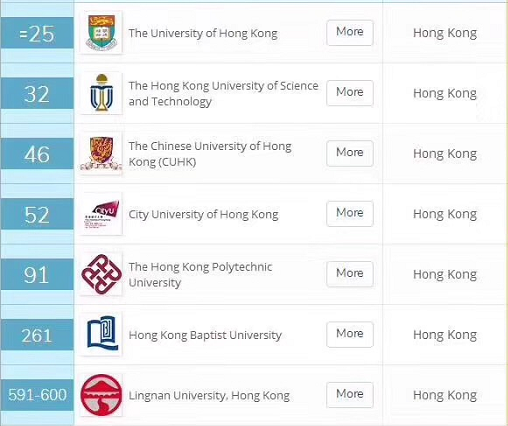 香港的大学在本次排名中进入世界百强的有5所,分别是香港大学、香港科技大学、香港中文大学、香港城市大学、香港理工大学。
