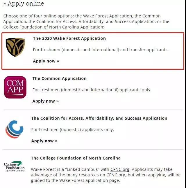 维克森林大学的申请有上图的 4 种途径:大学自身系统、 COMMON ( 8 月 1 日开放)、 CAAS ( 9 月 1 日开放)、北卡大学申请系统,不过后面 3 种都还没有开放,所以现在的申请需要通过维克森林大学自身系统。