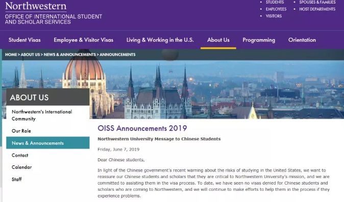鉴于中国政府向赴美学习的中国学生发出的警报信,西北大学向在校的及即将来校的全体中国学生及学者保证。 > 因为你们是西北大学完成历史使命所不可或缺的一个组成部分,我们有责任和义务帮助你们获取签证。到目前为止没有任何西北大学的中国学生及学者的签证申请得到拒签。我们将继续努力确保你们顺利获得签证。