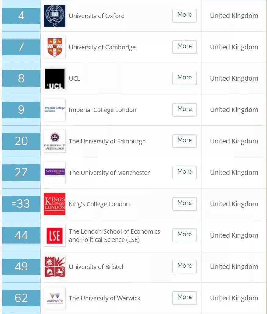 英国: 今年牛津大学前进一步来到第四位,仍然是英国最厉害的大学。但整体来看,英国大学的排名有所下滑,牛津、剑桥、UCL、帝国理工分列英国排名最高的四所大学。此外入围世界TOP100的还有诺丁汉大学(第96名)、南安普顿大学(第97名)、和圣安德鲁斯大学(第100名)。除了上述大学以外,进入TOP200的大学还包括伦敦玛丽女王大学(126)、兰卡斯特大学(128)、纽卡斯尔大学(146)、约克大学(148)、卡迪夫大学(154)、埃克塞特大学(163)、巴斯大学(172)、英国女王大学(173)、利物浦大学(181)、阿伯丁大学(194)。