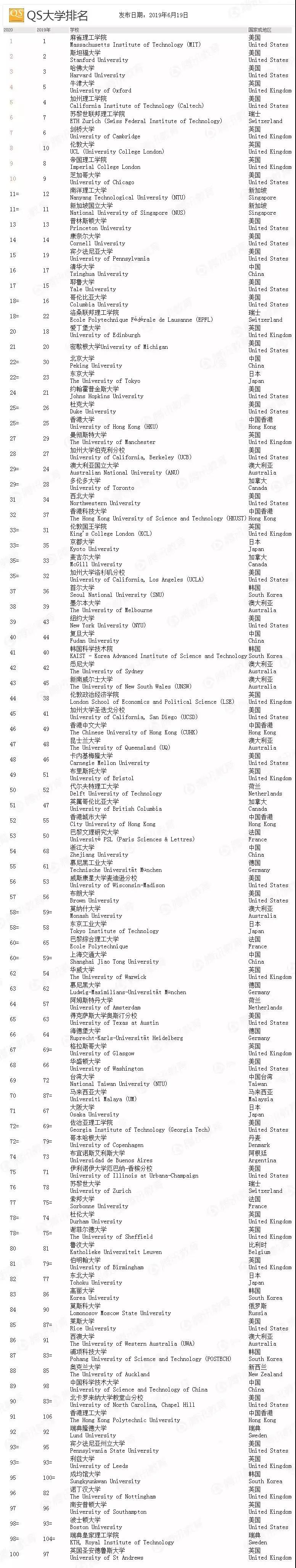 最后再为大家奉上一份完整的QS前100排名: